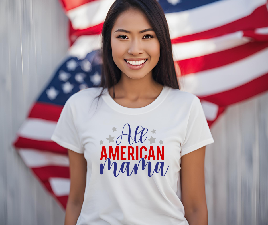 Show your patriotic mama spirit in this classic All American Mama tee! The fun, patriotic text across the front declares your all-star parenting status with fun, vintage flair. Whether you're cheering at the ballpark or grilling in the backyard, this casual v-neck tee lets you rock your laidback All American spirit in style.
